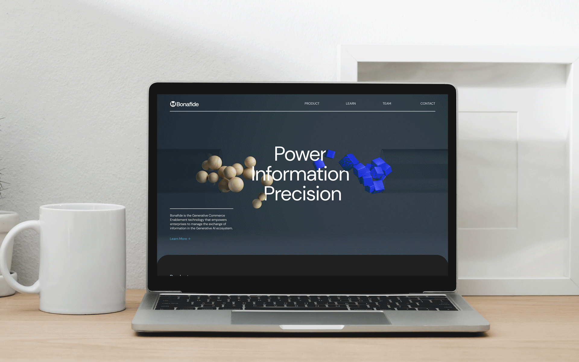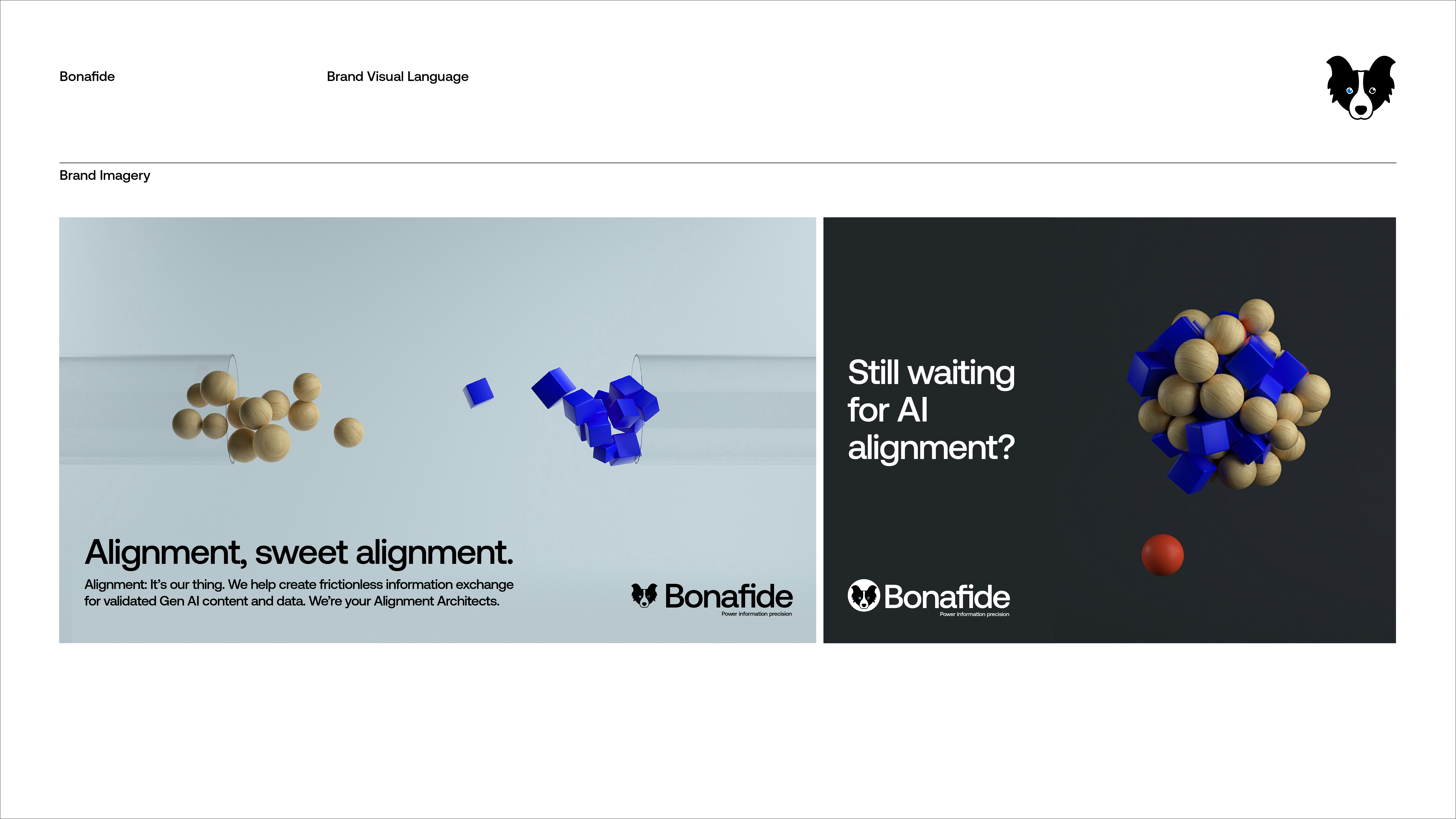 When we started working with Bonafide, they didn’t even have a name, just a smart but unwieldy descriptor: “A standard-based information exchange for validated content and data between Generative AI platforms and commercial enterprises.” Great business. Tough name. We landed on Bonafide, Latin for “in good faith.” Next, we built the identity. Bonafide is a loyal companion in AI alignment, so our logo features a Border Collie named Fido, the world’s smartest working dog. Border Collies keep livestock safe; Bonafide keeps information flows healthy. An intelligent companion that guides data, Bonadfide is an always-on, hardworking, watchful guardian.